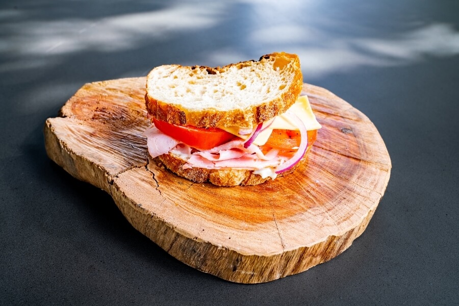Leg ham, cheese, tomato, aioli + spanish onion on sour dough