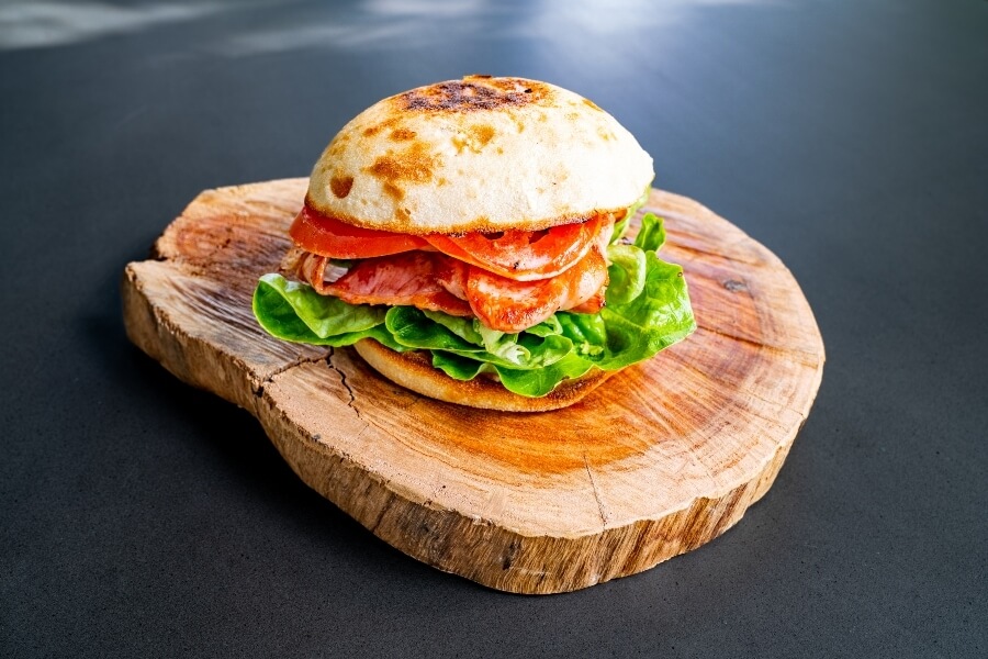 Double bacon, lettuce, tomato + aioli on a toasted Turkish roll