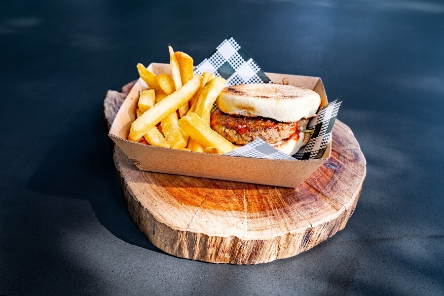Angus beef pattie, bacon, legg, caramelised onions, ettuce, tomato, beetroot and burger sauce